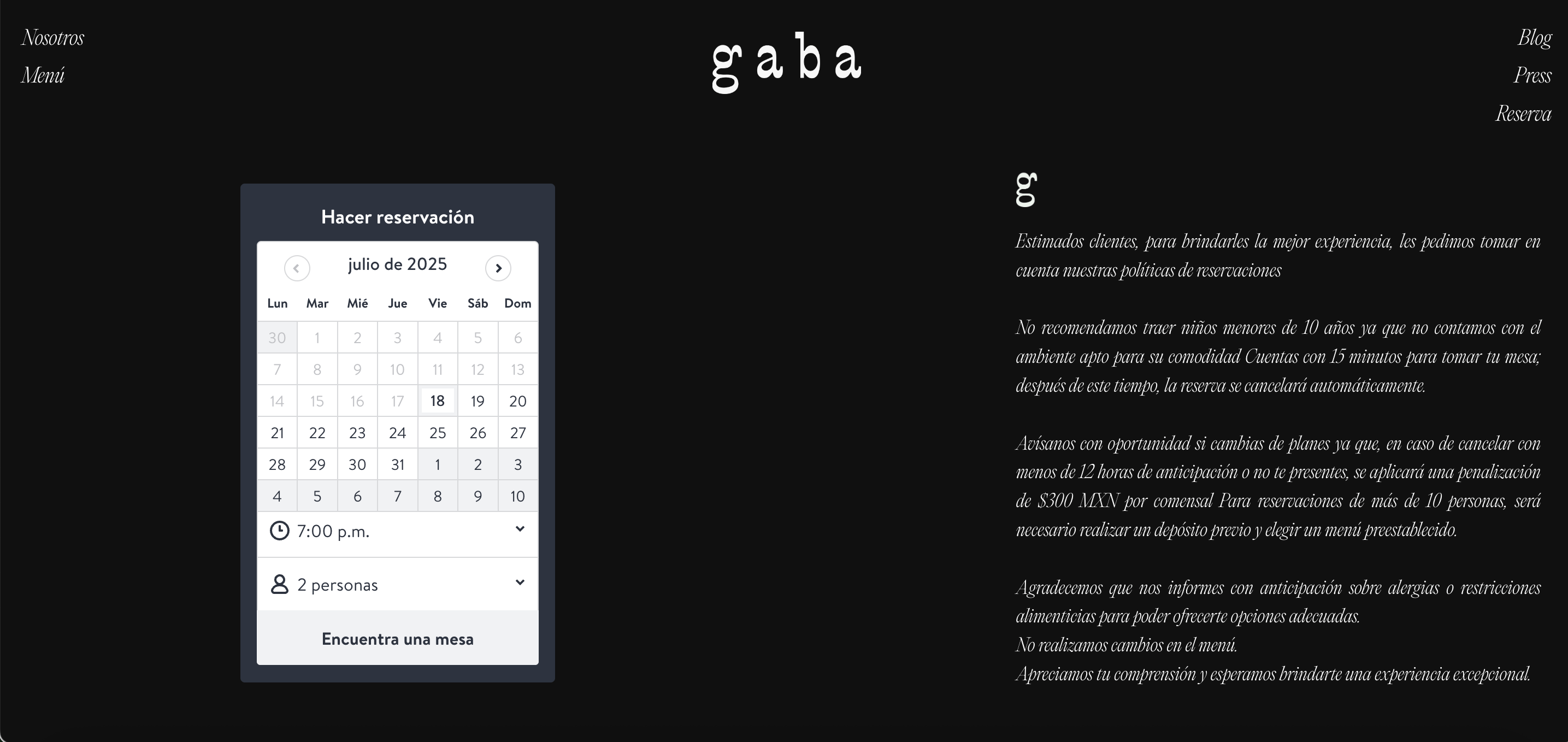 The main challenge was translating GABA’s intimate and elevated dining experience into a digital interface. The website had to feel immersive yet simple, showcase the chef’s vision, and support the restaurant’s operational needs — such as online reservations and press inquiries — without compromising the visual experience.