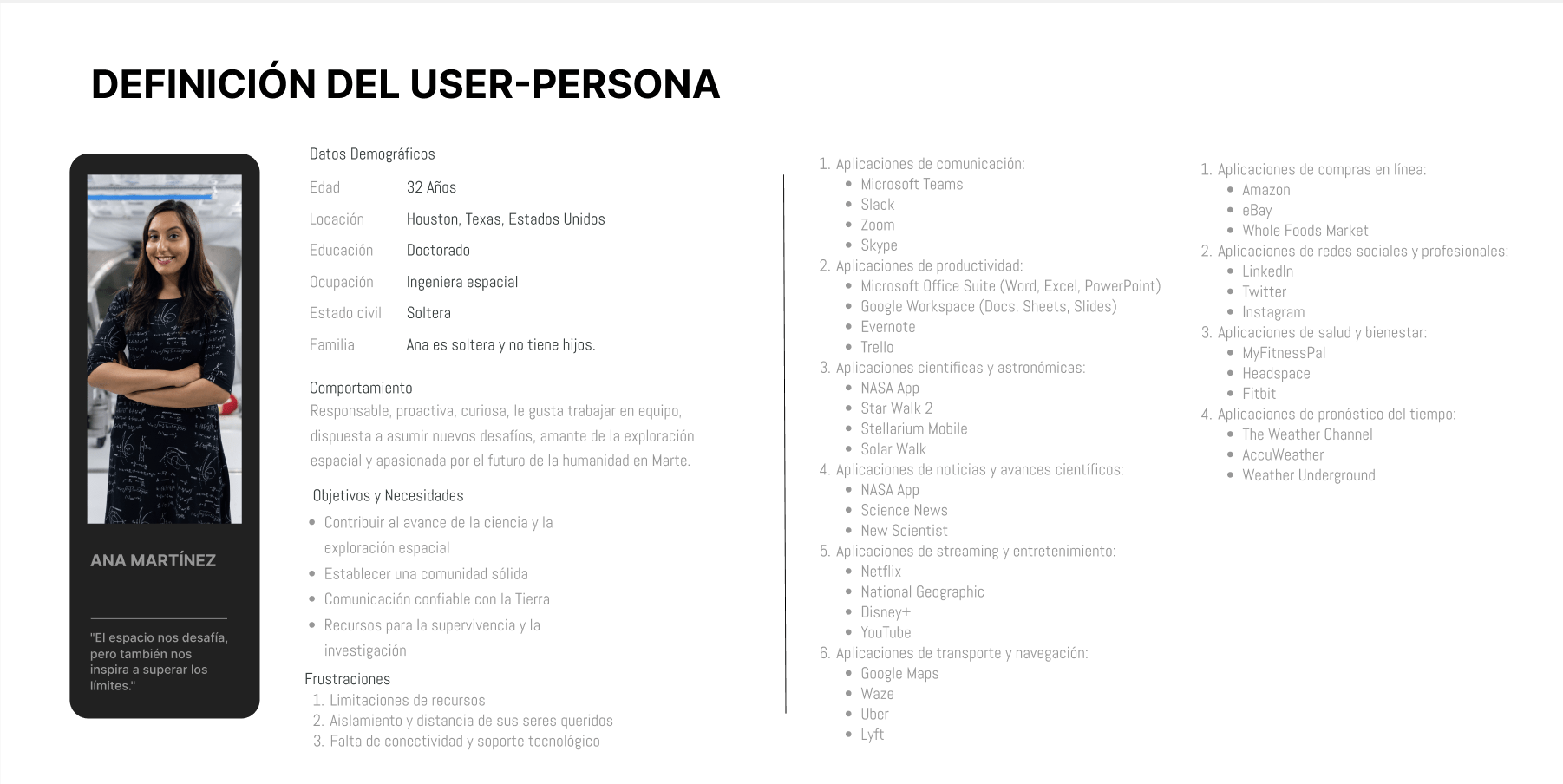 Gracias a la información recabada con entrevistas, se pudo llegar a una User Persona que podría ser habitante de la comunidad marciana. Se determinó su comportamiento, sus gustos, sus intereses y sus habilidades que posiblemente tendría en la tierra que podría hacer uso allá.